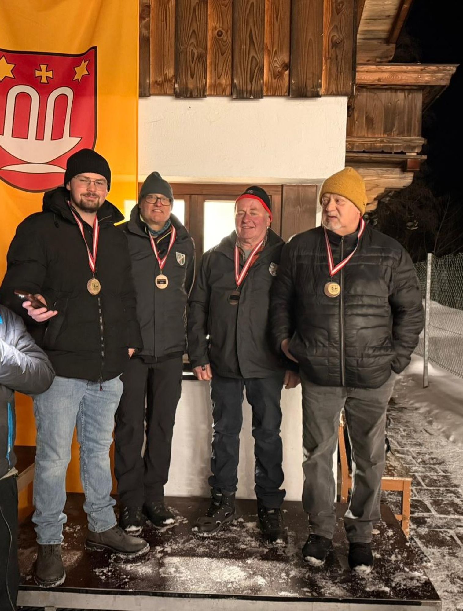 Bei den Herren traten wiederum die 2 Mannschaften des ersten Wettbewerbes wieder an. Diesmal holte sich die Mannschaft des ESV Erpfendorf 1 mit Georg Lechner, Wolfgang Loidl, Stefan Ehleben und Sepp Lechner den Sieg. Damit sind sie nicht nur Bezirksmeister, sondern gleichzeitig auch Landes-, Staats-, Europa- und Weltmeister 🤣. Herzliche Gratulation! Aber auch die Mannschaft ESV Erpfendorf 2 mit der Besetzung Michael Nothegger, Anton Oberleitner, Johann Resinger und Anton Inwinkl erreichte mit dem 3. Rang einen der begehrten Spitzenplätze auf dem Stockerl.